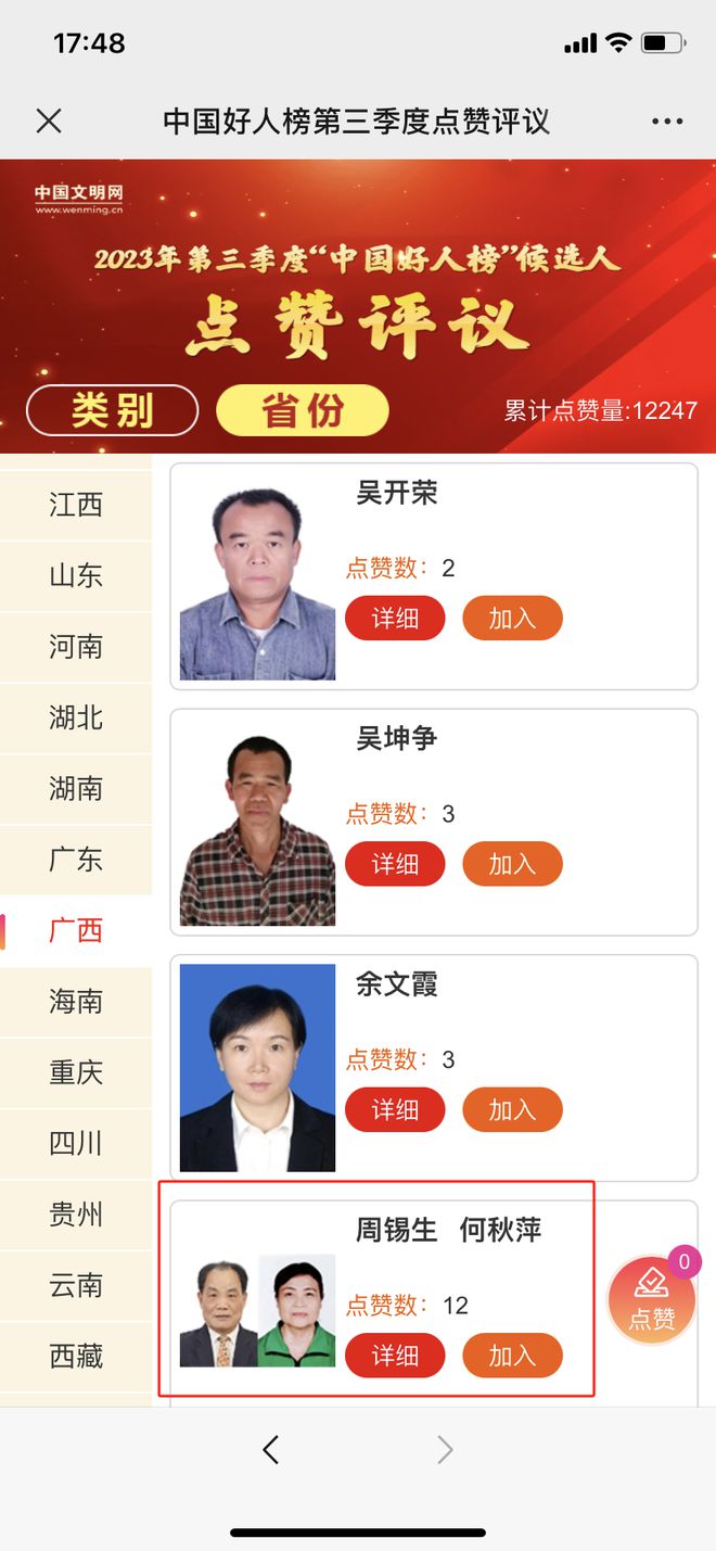 周錫生,男,1952年7月生,中共黨員,廣西壯族自治區(qū)柳州市柳城縣“老還童”彩調劇團團長。何秋萍,女,1958年4月生,廣西壯族自治區(qū)柳州市柳城縣“老還童”彩調劇團常務副團長。周錫生、何秋萍二人為夫妻關系。周錫生、何秋萍夫婦二人一生與彩調結緣,將畢生心血傾注在柳城彩調的教學和傳承工作上,退休前夕返鄉(xiāng)創(chuàng)建“老還童”彩調劇團,開設少兒彩調培訓班,培養(yǎng)近百名少年彩調演員,使瀕危的柳城彩調得以重獲新生。