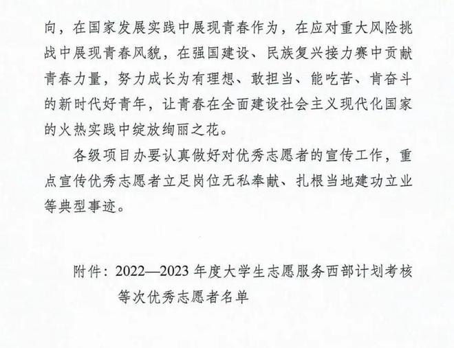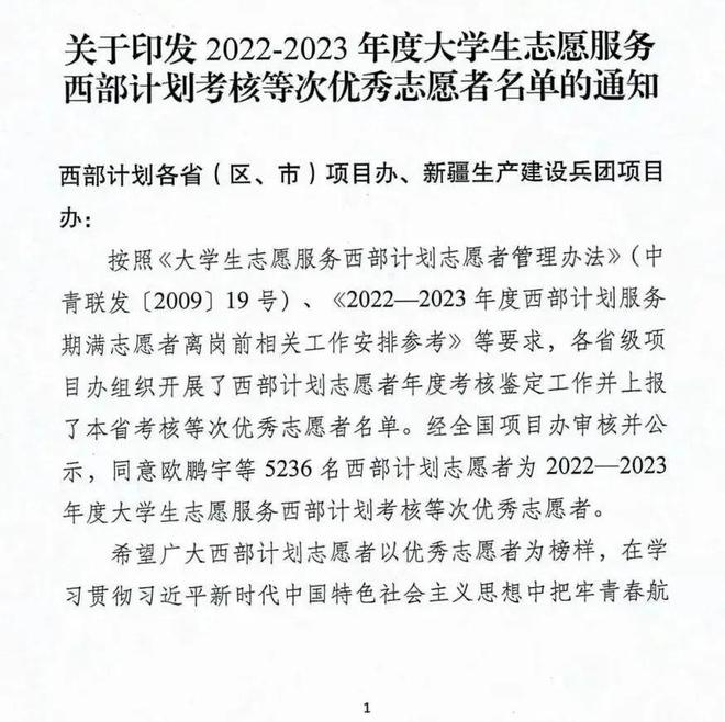 按照《大學(xué)生志愿服務(wù)西部計劃志愿者管理辦法》(中青聯(lián)發(fā)〔2019〕19號)、《2022—2023 年度西部計劃服務(wù)期滿志愿者離崗前相關(guān)工作安排參考》等要求,各省級項目辦組織開展了西部計劃志愿者年度考核鑒定工作并上報了本省考核等次優(yōu)秀志愿者名單。經(jīng)全國項目辦審核并公示,全國共有5236名西部計劃志愿者獲評2022—2023年度“大學(xué)生志愿服務(wù)西部計劃優(yōu)秀志愿者”。