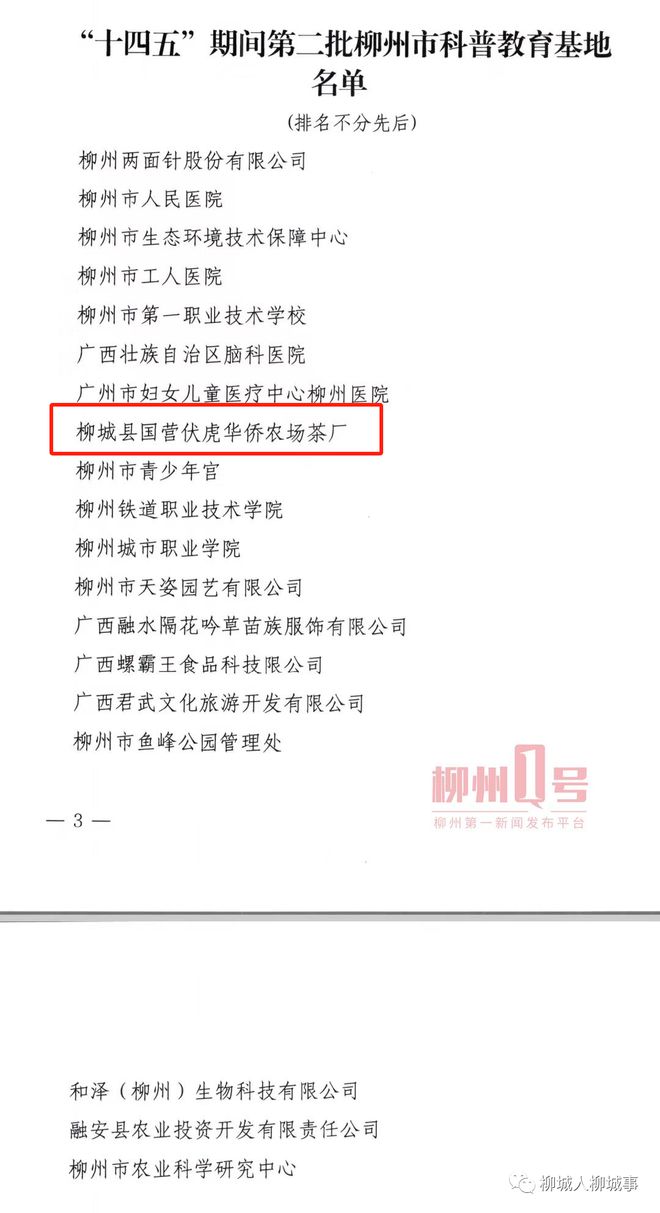 近日,柳州市科協(xié)公布了“十四五”期間第二批柳州市科普教育基地的認(rèn)定名單,共有 19家單位在內(nèi),基地有效期為五年,市民可免費(fèi)參觀打卡。其中,柳城縣國(guó)營(yíng)伏虎華僑農(nóng)場(chǎng)茶廠入選。
