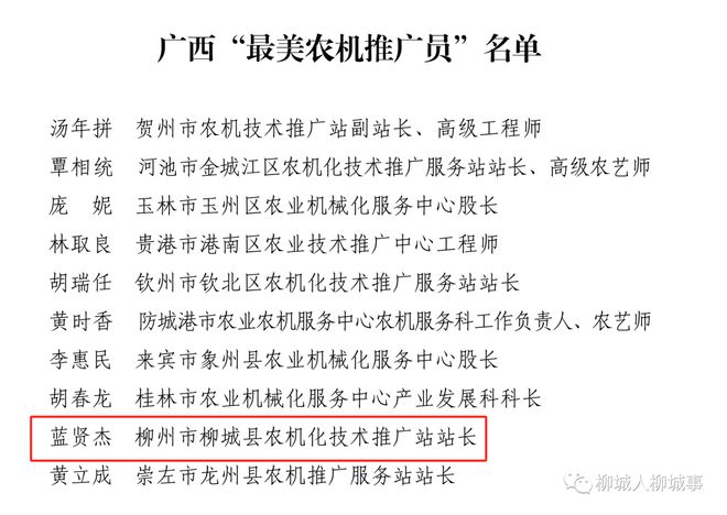 近日,廣西壯族自治區(qū)農(nóng)業(yè)機(jī)械化服務(wù)中心公布廣西“最美農(nóng)機(jī)推廣員”、優(yōu)秀農(nóng)機(jī)化示范項(xiàng)目、十佳農(nóng)機(jī)應(yīng)急救災(zāi)保障服務(wù)組織名單。其中,柳城縣農(nóng)機(jī)化技術(shù)推廣站站長藍(lán)賢杰榮獲廣西“最美農(nóng)機(jī)推廣員”稱號。