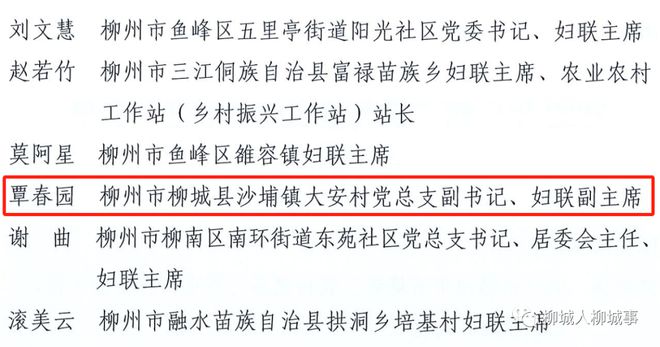 近日,自治區(qū)婦聯(lián)通報表揚100名廣西“最美基層婦聯(lián)干部”。其中,柳城縣沙埔鎮(zhèn)大安村黨總支副書記、婦聯(lián)副主席覃春園上榜。