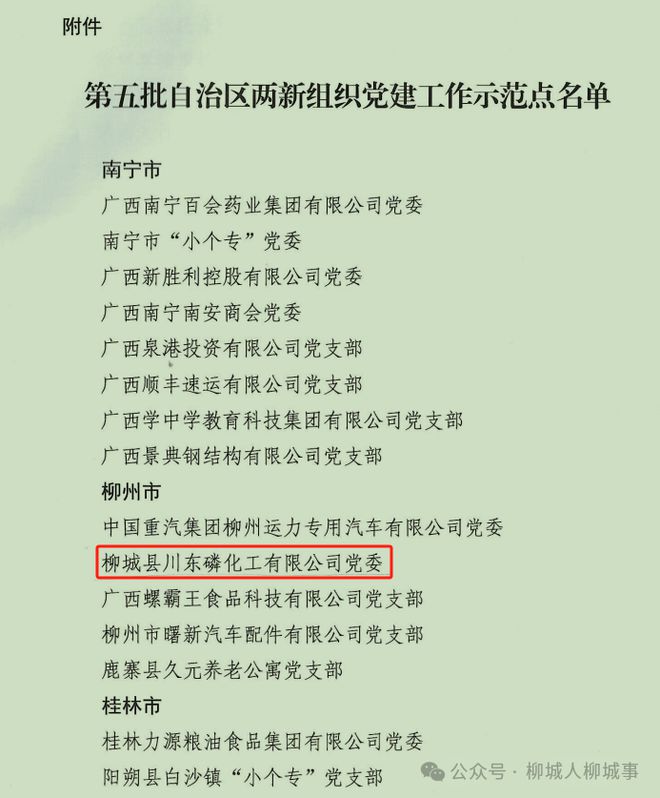 近日,經(jīng)自治區(qū)黨委組織部、自治區(qū)兩新組織黨工委研究,確定47個(gè)兩新組織基層黨組織為第五批自治區(qū)兩新組織黨建工作示范點(diǎn),柳城縣川東磷化工有限公司黨委獲此榮譽(yù)。