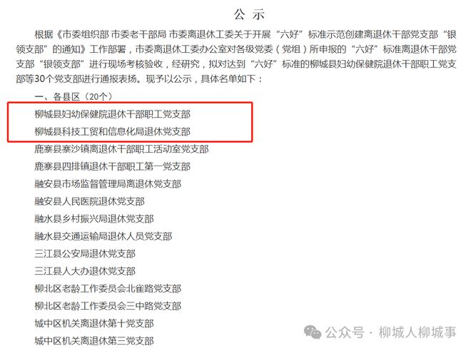 近日,中共柳州市委老干部局、中共柳州市委離退休干部工作委員會聯(lián)合印發(fā)了《關(guān)于確定2023年柳州市離退休干部黨組織“銀領(lǐng)支部”的通知》,其中,柳城縣婦幼保健院退休干部職工黨支部和柳城縣科技工貿(mào) 和信息化局退休黨支部入選。