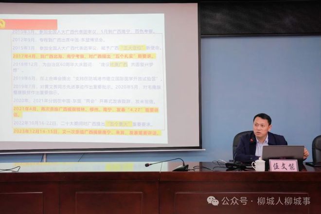劉國(guó)平同志以《深刻領(lǐng)悟習(xí)近平文化思想》為題,從習(xí)近平文化思想提出的時(shí)代背景、習(xí)近平文化思想的重大意義、習(xí)近平文化思想的豐富內(nèi)涵、把握習(xí)近平文化思想的實(shí)踐要求四個(gè)方面,深入解讀習(xí)近平文化思想的豐富內(nèi)涵;伍文能同志以《為推進(jìn)中國(guó)式現(xiàn)代化建設(shè)柳州實(shí)踐匯聚強(qiáng)大力量》為題,闡述了習(xí)近平總書(shū)記對(duì)廣西重大方略要求對(duì)奮力推進(jìn)中國(guó)式現(xiàn)代化柳州實(shí)踐的重大意義。