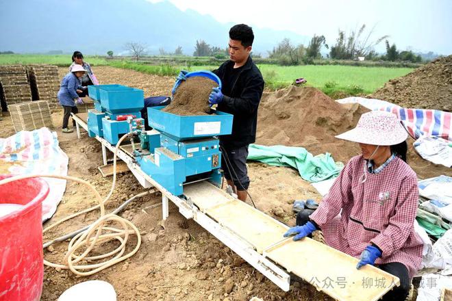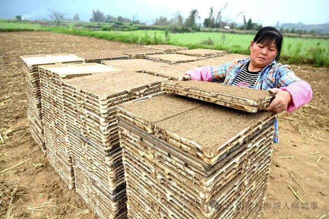 記者在現(xiàn)場(chǎng)看到,6名工人分工有序,有的放秧盤,有的倒土,還有的搬運(yùn)秧盤。而撒上谷種的秧盤,被整齊地疊放在一起。