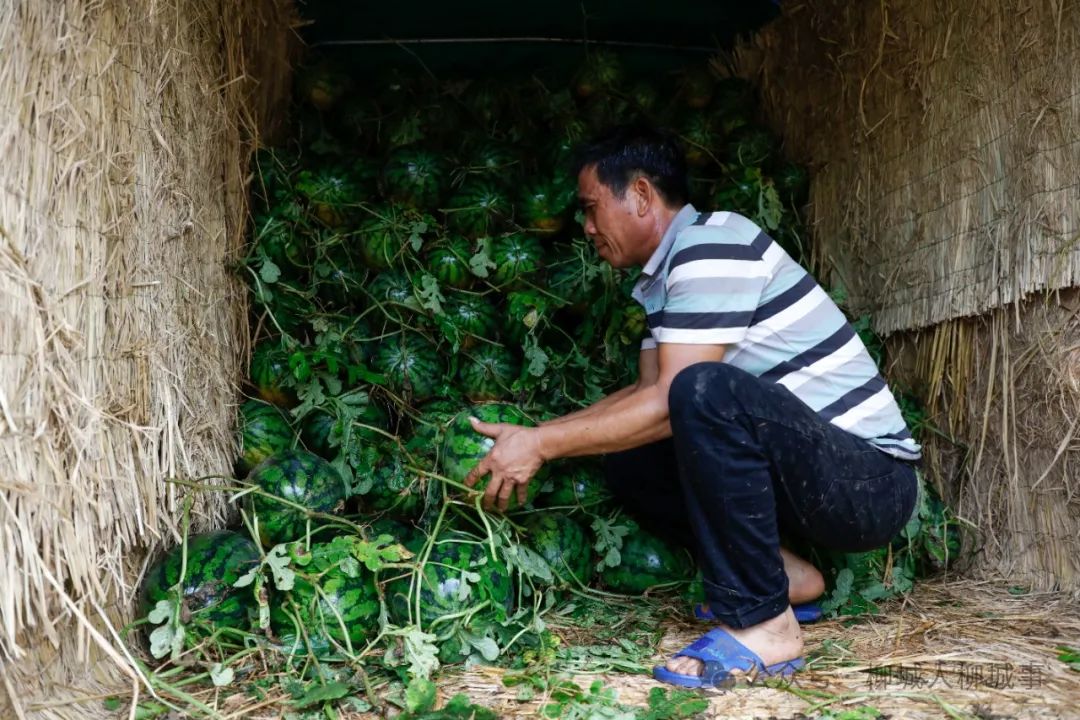 工人們正在西瓜地里忙活,他們先將剪斷藤的西瓜堆放在一起,再開(kāi)車(chē)到地頭,用接力的方式將成堆的西瓜搬運(yùn)上車(chē)。