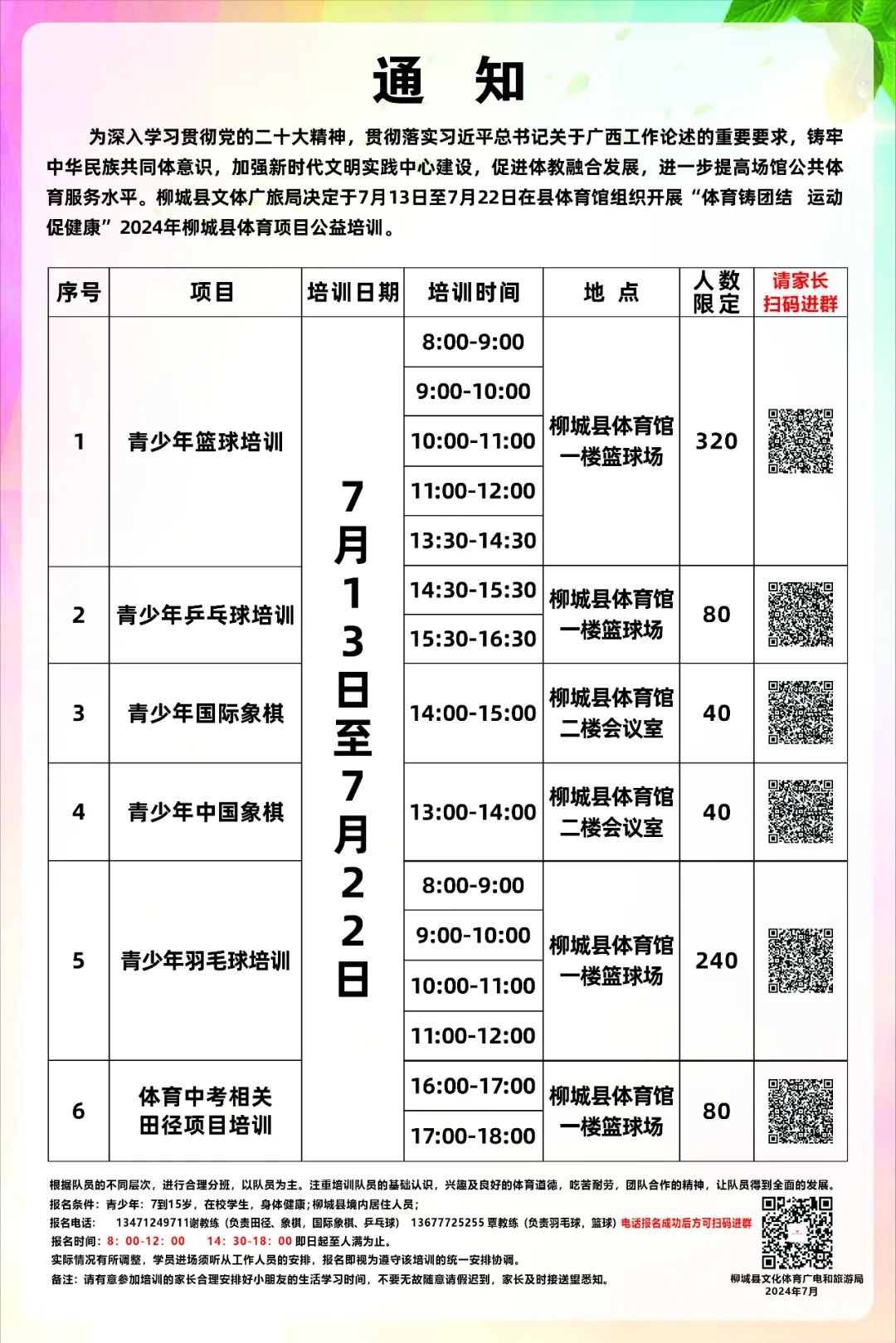 為促進(jìn)體教融合發(fā)展,進(jìn)一步提高場館公共體育服務(wù)水平,柳城縣文化體育廣電和旅游局決定于7月13日至7月22日,在縣體育館組織開展“體育鑄團(tuán)結(jié)?運動促健康”2024年柳城縣體育項目公益培訓(xùn)。