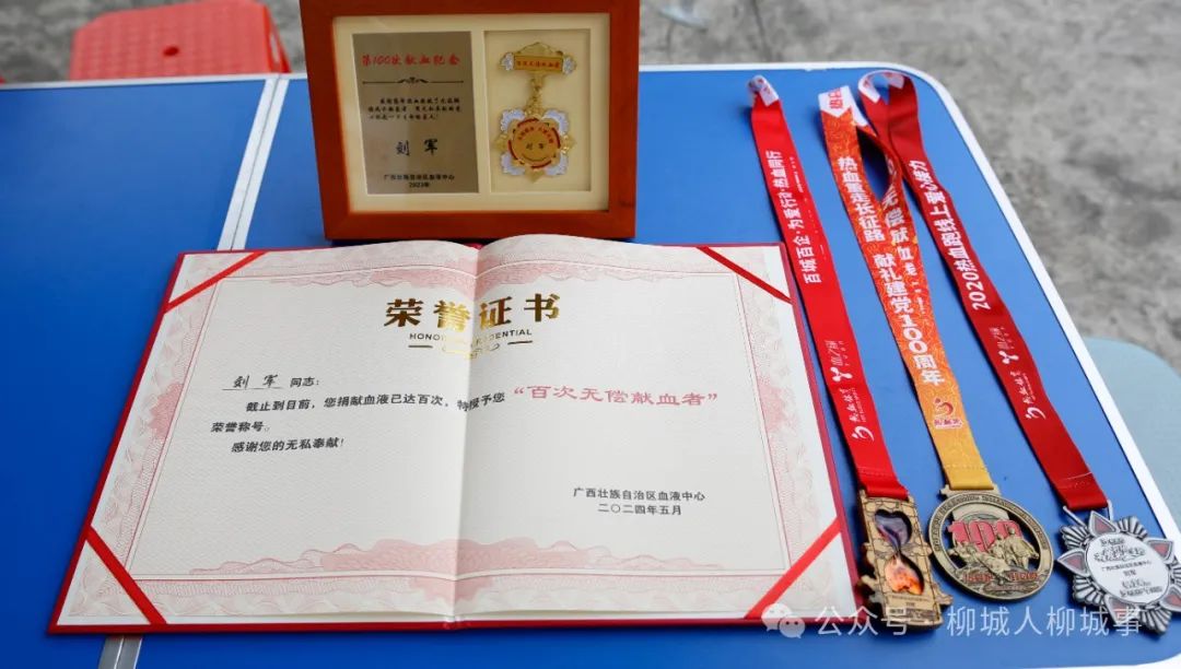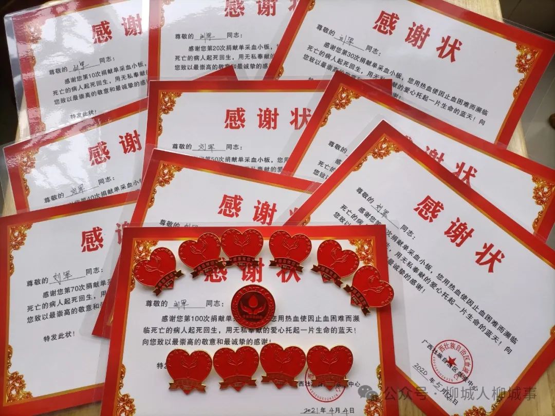 今年55歲的劉軍榮獲了柳州市無償獻血促進獎、柳州市無償獻血志愿服務(wù)五級之星獎、柳州市無償獻血三級之星獎、柳州市獻血之星終身成就獎等市級榮譽,以及全國無償獻血奉獻獎金獎、全國無償獻血志愿服務(wù)三級之星獎等國家級榮譽。2022年,劉軍還獲得了全國無償獻血終身榮譽獎,這是國家授予無償獻血者的最高榮譽。