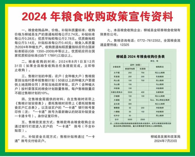 根據(jù)《《自治區(qū)農(nóng)業(yè)農(nóng)村廳、自治區(qū)發(fā)展改革委、自治區(qū)財政廳、自治區(qū)糧食和儲備局、農(nóng)發(fā)行廣西分行關(guān)于印發(fā)2024年稻谷補(bǔ)貼實(shí)施方案的通知》(桂農(nóng)廳發(fā)〔2024〕37號)文件精神,現(xiàn)將柳城縣2024年糧食收購政策通告如下: