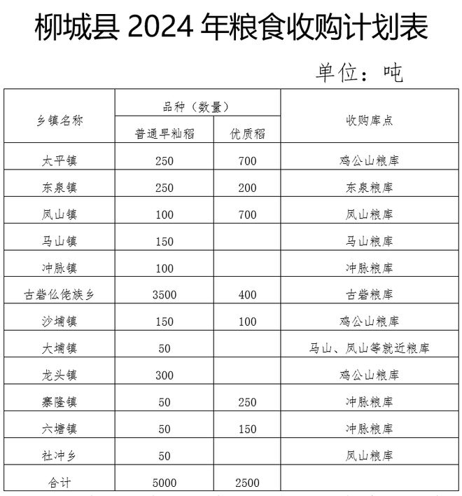 2024年自治區(qū)下達(dá)給柳城縣的糧食收購任務(wù)是7500噸,其中普通秈稻5000噸、優(yōu)質(zhì)稻(含專用稻)2500噸。根據(jù)柳城縣糧食種植情況,糧食收購計劃安排如下: