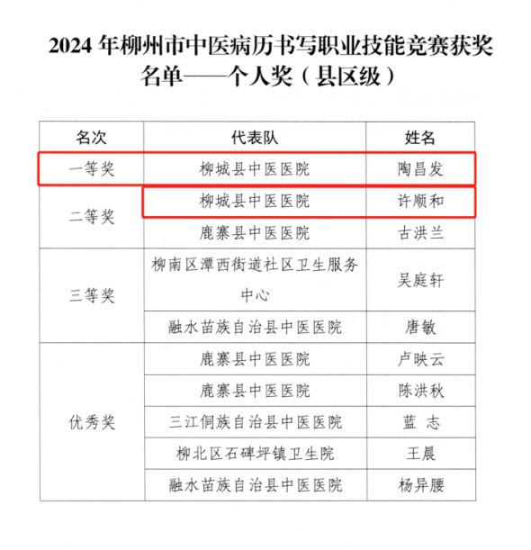 近日,在柳州市舉辦的中醫(yī)病例書寫職業(yè)技能競賽中,柳城縣中醫(yī)醫(yī)院陶昌發(fā)醫(yī)師和許順和醫(yī)師憑借扎實的醫(yī)學(xué)功底和精湛的病例書寫技巧,分別榮獲一等獎和二等獎。這一佳績不僅展現(xiàn)了兩位醫(yī)師的專業(yè)實力,也為柳城縣中醫(yī)醫(yī)院贏得了榮譽。