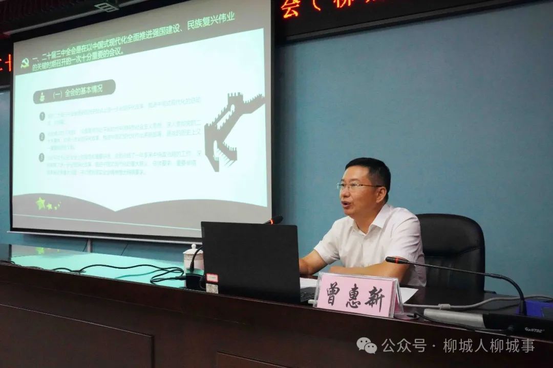 曾惠新以《學(xué)習(xí)貫徹黨的二十屆三中全會(huì)精神 奮力推進(jìn)中國(guó)式現(xiàn)代化柳州實(shí)踐》為主題,從召開(kāi)黨的二十屆三中全會(huì)的重大意義、學(xué)習(xí)貫徹習(xí)近平總書記在黨的二十屆三中全會(huì)上的重要講話精神、全面準(zhǔn)確理解《中共中央關(guān)于進(jìn)一步全面深化改革、推進(jìn)中國(guó)式現(xiàn)代化的決定》提出的進(jìn)一步全面深化改革重大舉措,以及立足柳州實(shí)際學(xué)習(xí)貫徹好黨的二十屆三中全會(huì)精神等4個(gè)方面,深入解讀黨的二十屆三中全會(huì)精神的豐富內(nèi)涵,闡述全會(huì)精神對(duì)奮力推進(jìn)中國(guó)式現(xiàn)代化柳州實(shí)踐的重大意義。