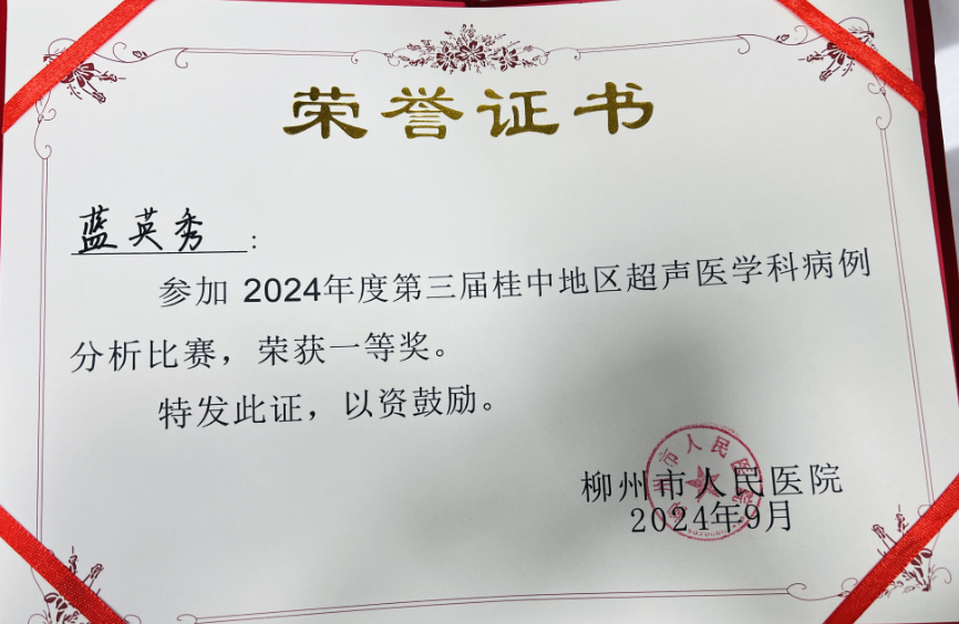這次比賽是柳城縣人民醫(yī)院超聲科首次參加病例分享,成績的取得是對個(gè)人能力的肯定,更是對醫(yī)院超聲科整個(gè)團(tuán)隊(duì)專業(yè)水平的認(rèn)可。柳城縣人民醫(yī)院超聲科將以此次為新的起點(diǎn),繼續(xù)在臨床診療服務(wù)工作中精耕細(xì)作,為患者提供更優(yōu)質(zhì)的服務(wù)。