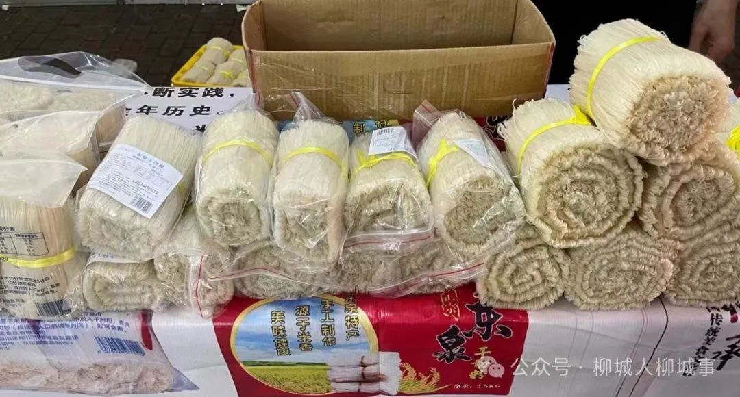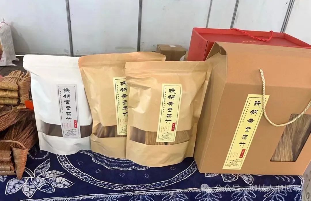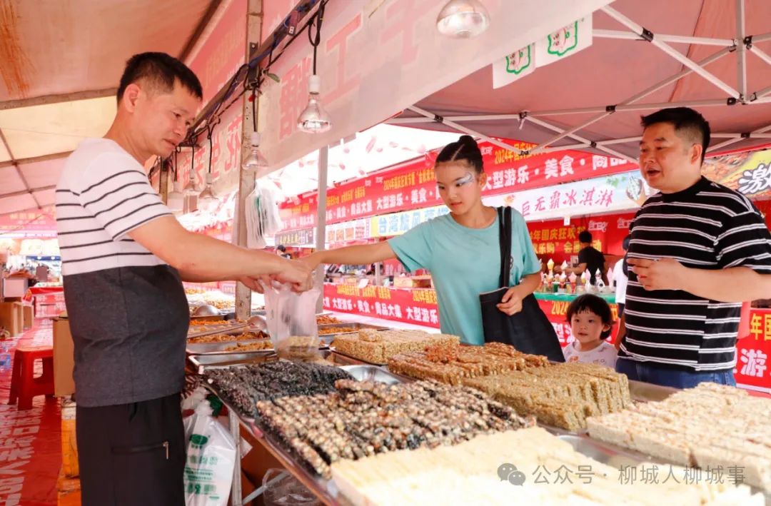 舞臺周圍設(shè)置了展位,除了柳城非遺腐竹、干切粉、牛臘巴等本土農(nóng)特產(chǎn)品外,還有其他美食小吃、家用器具、家居服裝等商品,攤位前的人流也絡(luò)繹不絕。大家邊走邊看邊嘗,挑選心儀物品,享受逛街購物的快樂。