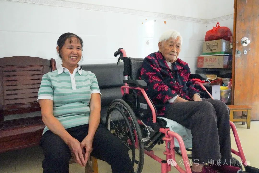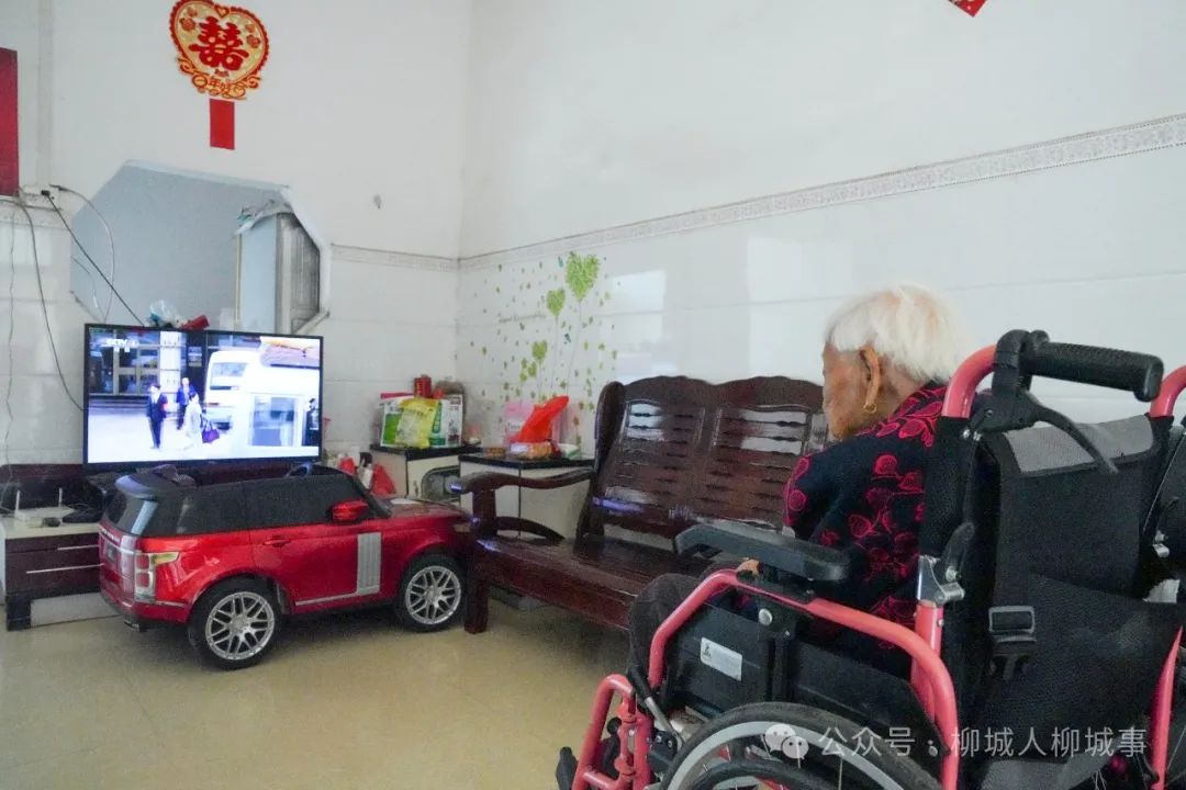 出洛崖社區(qū)右拐,行不多遠(yuǎn)就到歐水英的家。小小的院落拾掇得很整潔,屋內(nèi)隱約傳出聲音。走進去一看,再過兩個月就要迎來101歲生日的歐水英端坐在輪椅上,精神矍鑠,目光炯炯,正津津有味地看著電視熱播劇呢。專門照顧她的二兒媳婦韋玉英介紹說,老人生活作息很有規(guī)律,早上起來吃了早餐后看會兒電視,午飯畢還要睡個午覺;胃口也不錯,不挑食,白切雞之類的幫她剪成小塊,也能吃得了。