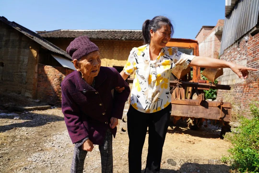 相較于歐水英的行動不便,105歲的吳二妹就“雄頭”多了。歲月在她臉上刻出了無數(shù)溝壑,但她似乎并不服老。在她眼里,上街就是“走幾步”的事情。她家就在去往知青城的路邊,離圩棚也不遠(yuǎn),腿腳相對靈便的她,由著性子,“想趕圩就去趕圩”。黃慶娥說,時常見到吳二妹老人自個上街買水果吃,社區(qū)群眾看到都喜歡逗她開心。