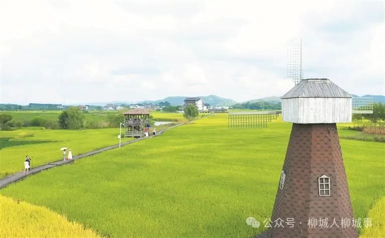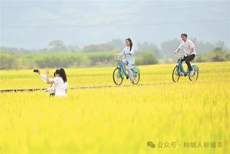 “這組田園風(fēng)光太出彩了?!庇慰突蝌T行或漫步于觀光步道,用相機(jī)、手機(jī)記錄下風(fēng)吹稻浪的美景。