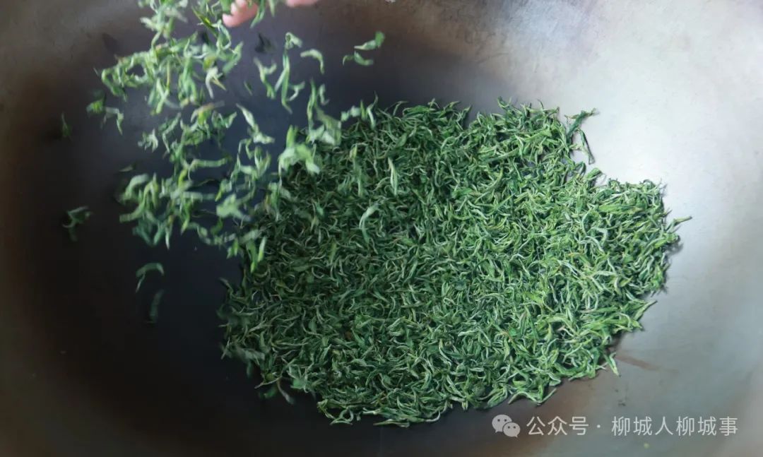 傳統(tǒng)手工炒茶,殺青是最為關鍵的環(huán)節(jié),時間、溫度、手法都影響著茶葉的品質(zhì),炒制人需要根據(jù)茶葉的水分,及時調(diào)整炒鍋的溫度和手法?!爱敃r鍋里面的溫度有200多度,手都被燙起泡了?!眲⒃戮暾f,被燙起泡是每個制茶人學習炒茶的“標配”。
