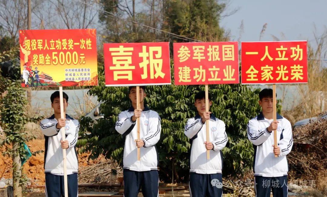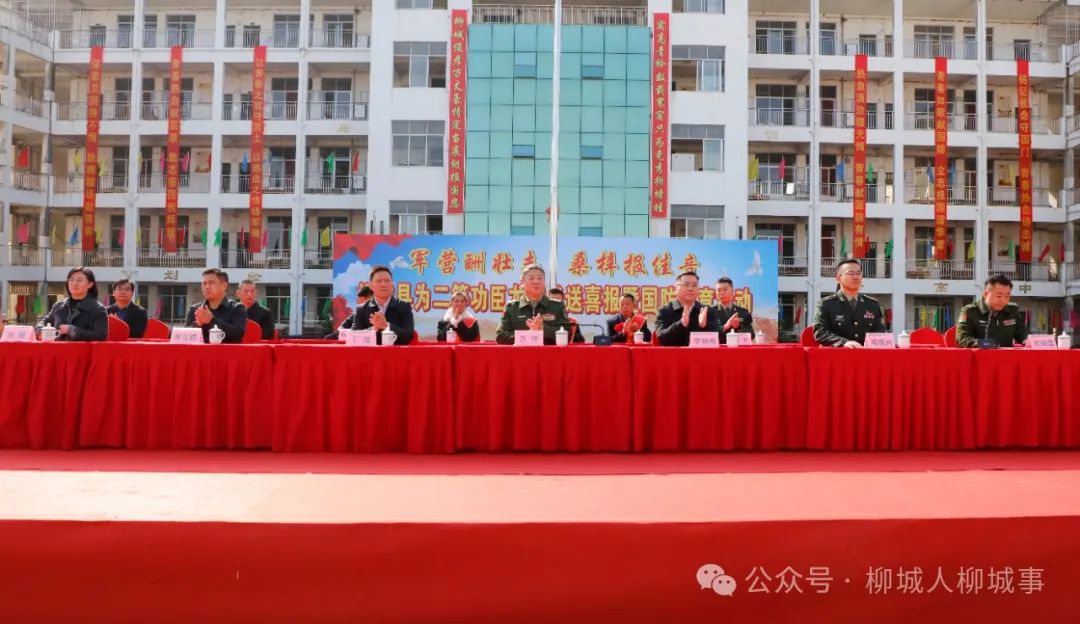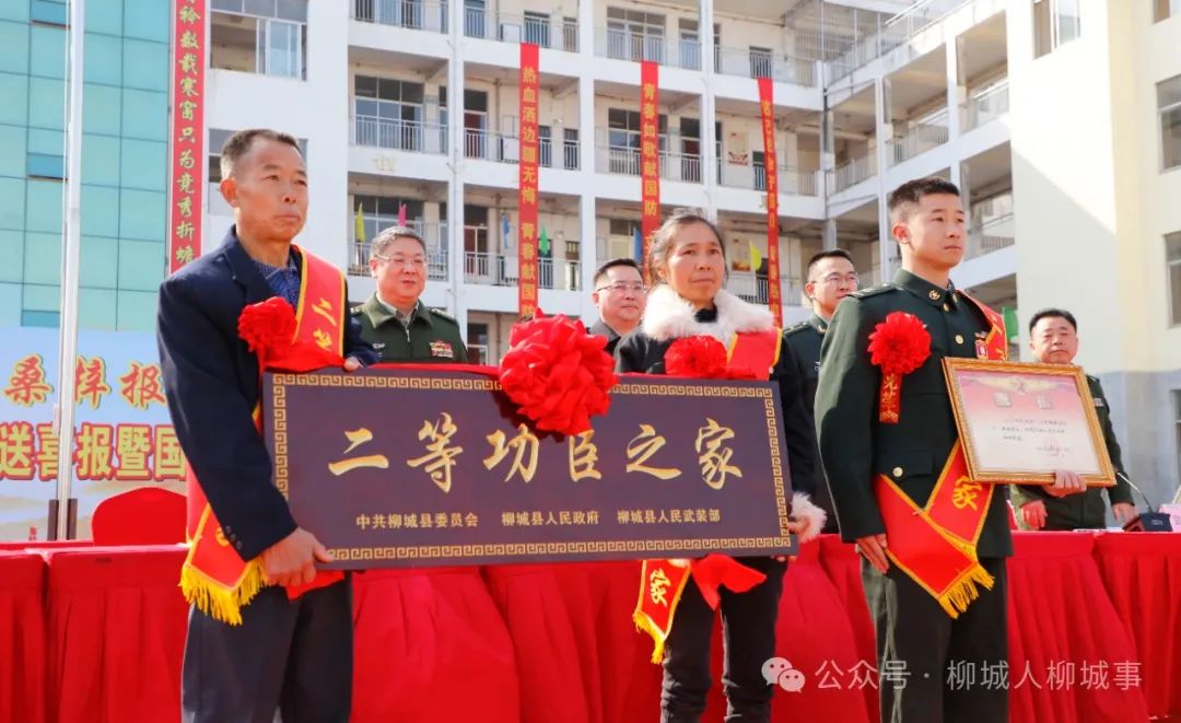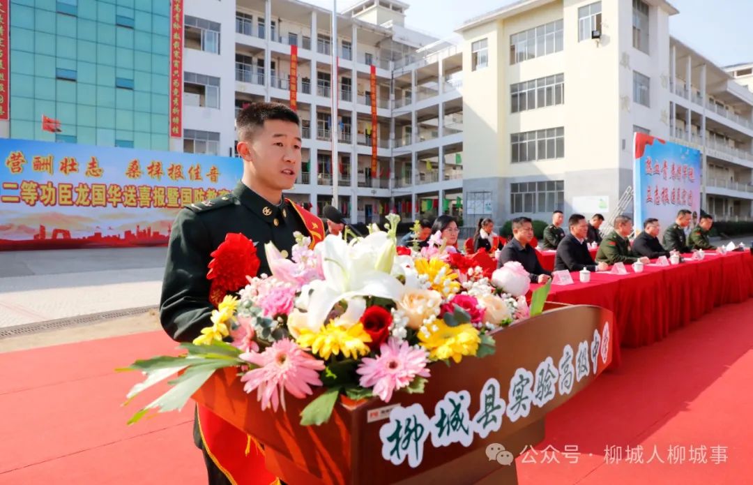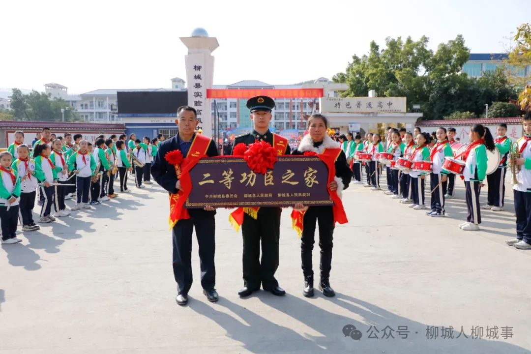 鑼鼓喧天,舞獅表演熱鬧非凡,1月16日,柳城縣在實驗高級中學開展軍地聯(lián)合送喜報活動,為榮立二等功的現(xiàn)役軍人龍國華及家屬送去立功喜報,讓軍人軍屬共享榮耀,激勵有志青年投身軍旅,建功立業(yè)。
