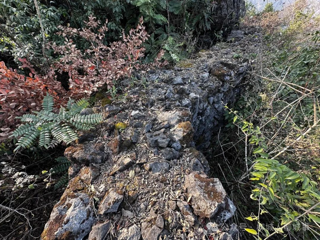 在630多米海拔的山凹處,我們看到了歷經(jīng)幾百年風(fēng)雨侵蝕的石墻。由于潘叔把石墻周圍的灌木和雜草砍修過,我們得以清晰地看到石墻原貌,還能一寸寸觸摸到石墻,感知石墻的斑駁與神秘。