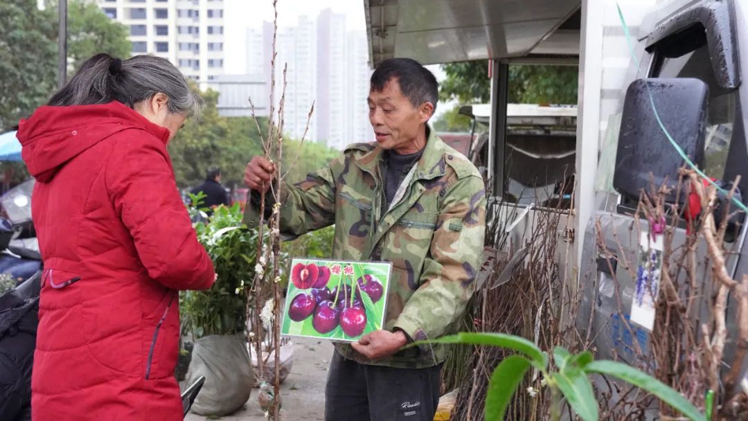 像陳老板這樣早早出攤的攤主不在少數(shù)。大家陸續(xù)將苗木精心擺放整齊,每棵苗木都包裹著營養(yǎng)棒,并清晰標(biāo)注品種。攤主們熱情地向前來咨詢的群眾介紹種植方法與注意事項(xiàng)。
