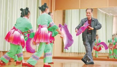 周錫生在柳城縣實(shí)驗(yàn)小學(xué)輔導(dǎo)學(xué)校彩調(diào)社團(tuán)的學(xué)生。湯曉逵攝(人民視覺)