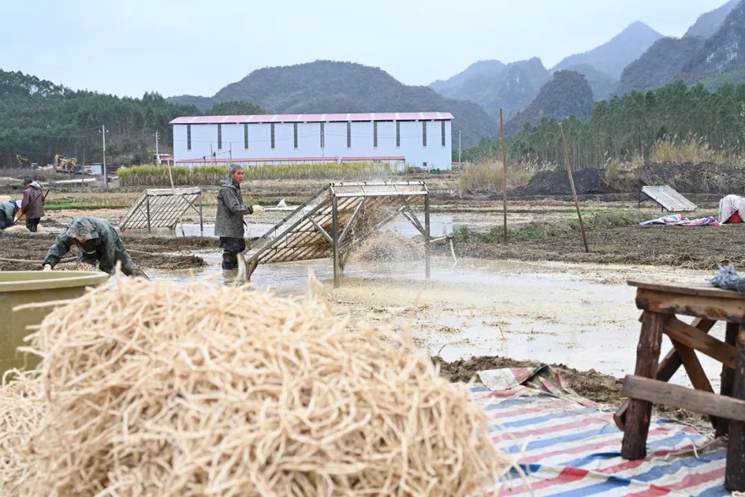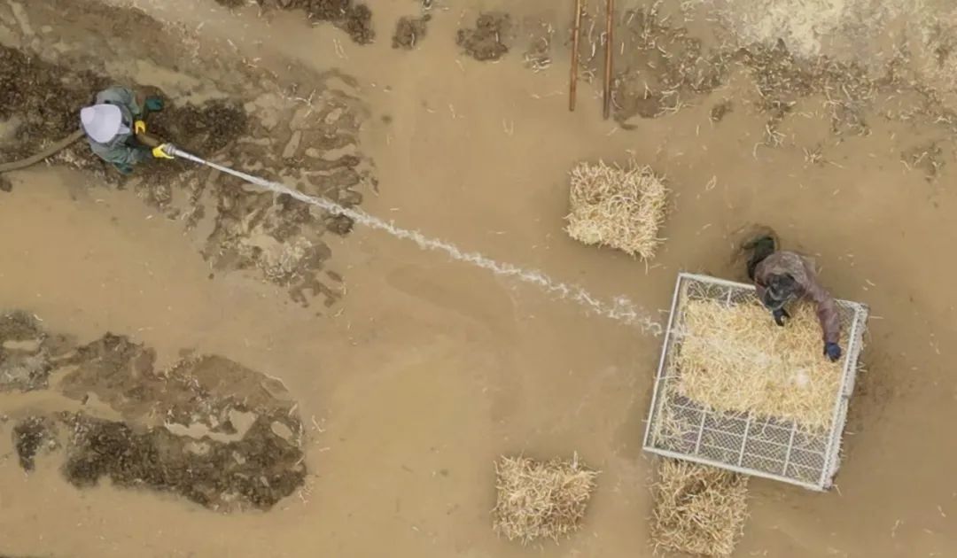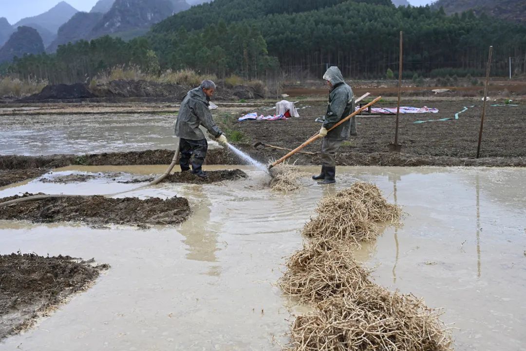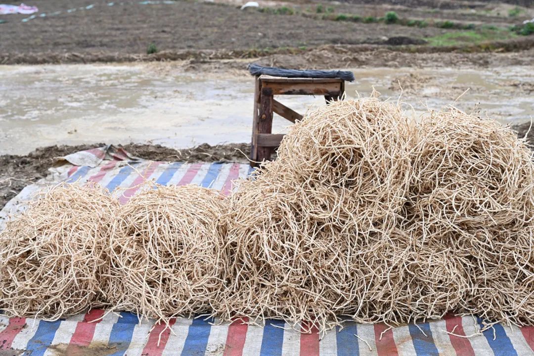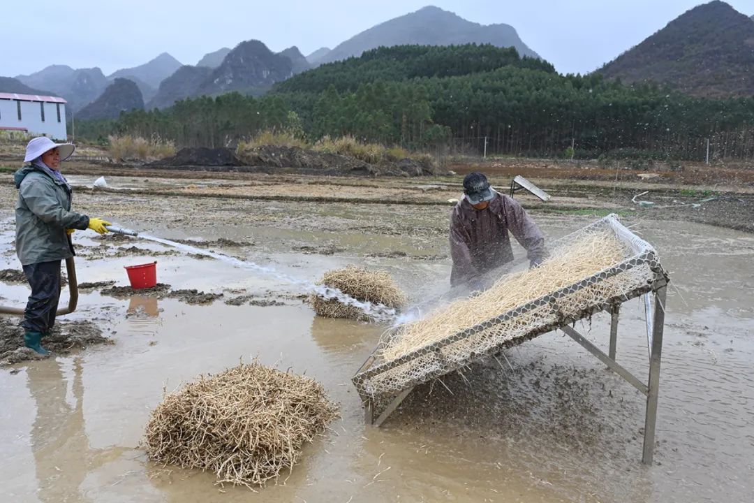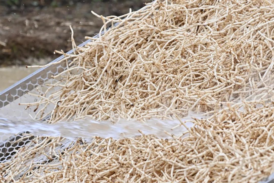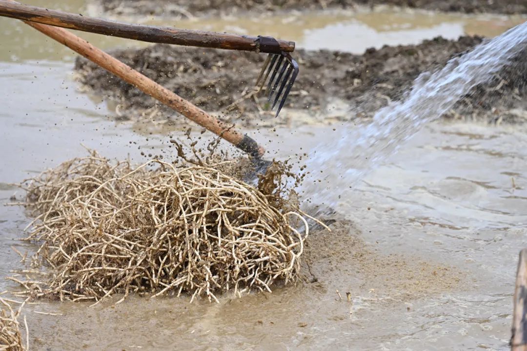 田野里,村民羅秦恒和妻子全副武裝,正在用高壓水槍采收魚(yú)腥草。他說(shuō),魚(yú)腥草的根系都是橫著長(zhǎng)的,所以并不會(huì)在地里扎得很深,用水槍把表面的泥土沖走后,再把水槍插在土里,通過(guò)水壓的作用,很快就把魚(yú)腥草根和泥土分離了。加上管護(hù)得好,這樣用水槍一點(diǎn)點(diǎn)沖開(kāi)后,一大塊魚(yú)腥草根就顯現(xiàn)在眼前。在田水里沖了一遍后,再放在架子上正反面各沖一遍,這時(shí)候幾處看不到魚(yú)腥草上沾著泥土,這些就是可以直接交易的白白嫩嫩的魚(yú)腥草根了。