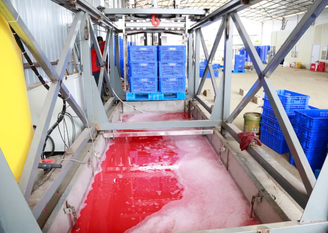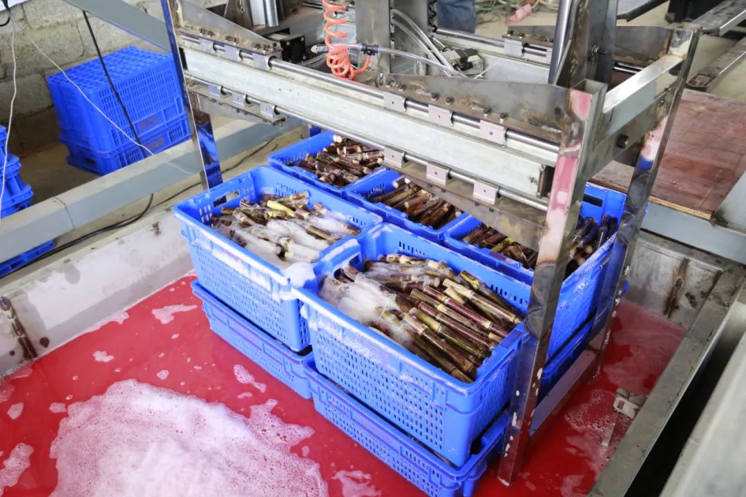 在加工廠里小編看到,工人們先將從北海市糖料蔗良種繁育基地上拉來(lái)的全莖蔗種剝?nèi)ト~片,運(yùn)到一臺(tái)臺(tái)糖料蔗切割機(jī)上,切成30厘米左右均勻的雙芽蔗段。切割好的蔗段被放入周轉(zhuǎn)筐內(nèi),再運(yùn)到藥水池里連筐浸泡。經(jīng)過(guò)藥水浸泡后的蔗段,便可以供應(yīng)蔗農(nóng)種植。