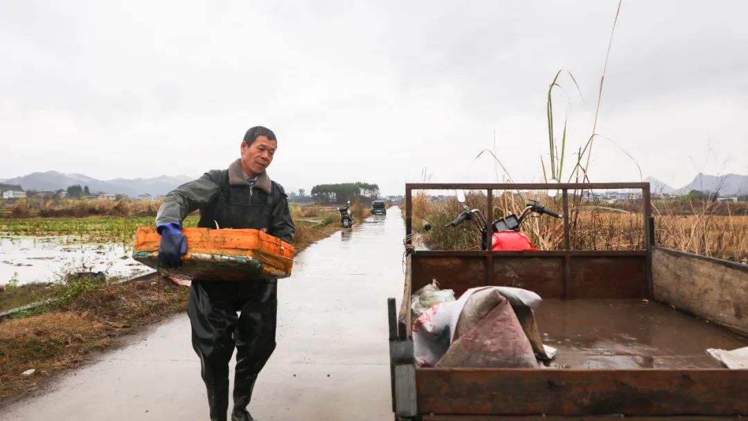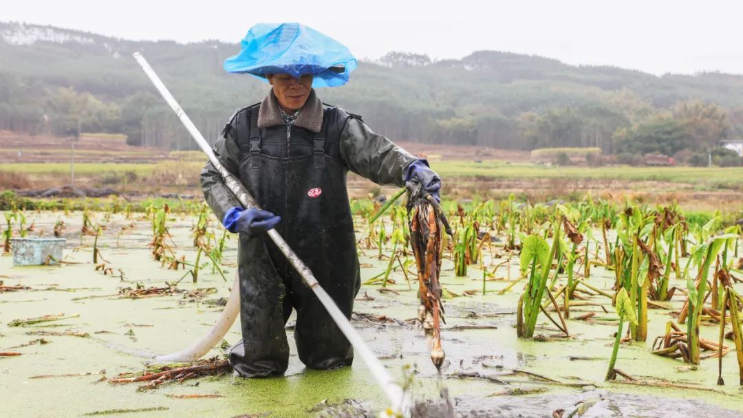 2月21日,小編來到柳城縣鳳山鎮(zhèn)二塘村,盡管天空下著雨,農(nóng)戶伍忠利和妻子仍然頭戴防水帽,身著防水褲,小心翼翼地踏入泥濘的水田中采收茨菇。