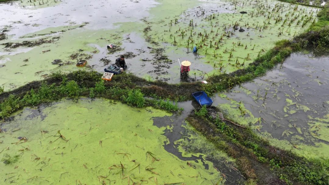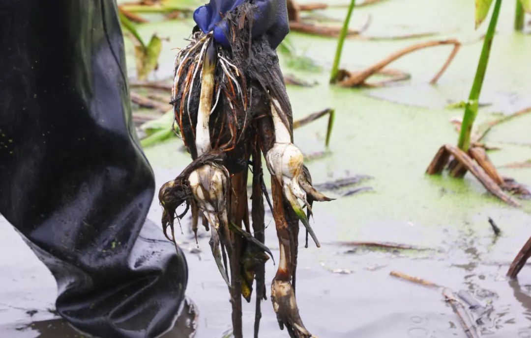 伍忠利左手伸到水里,抓住茨菇的莖葉用力一拔,右手用高壓手槍沖擊剛拔出的茨菇,妻子緊隨其后,將漂浮在水面的茨菇去除泥土和雜草后,放到旁邊的箱子里。