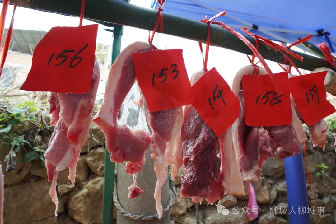 社節(jié)最引人注目的環(huán)節(jié)莫過于分社肉。當天,500多名村民共同集資購買的八頭豬被宰殺并精心切割,每一塊肥瘦相間的豬肉都被整齊地懸掛在竹竿上,并標有序號。隨后,村民們通過抽簽確定順序,依據各自抽取的序號依次領取對應的豬肉。