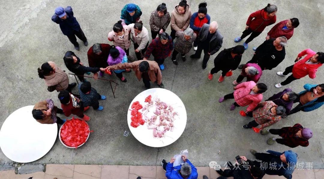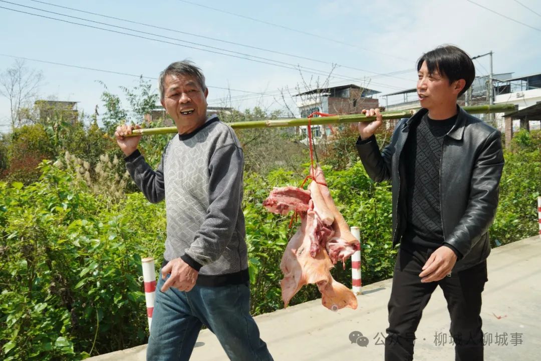 每到春分,石林屯都會湊錢買豬、殺豬,分百家肉?!胺职偌胰夂苡袃x式感,能感受到我們村團結友愛的氛圍,今年我特地帶女兒來參與?!毙录奕胧滞偷拇迕駠姥┱f。
