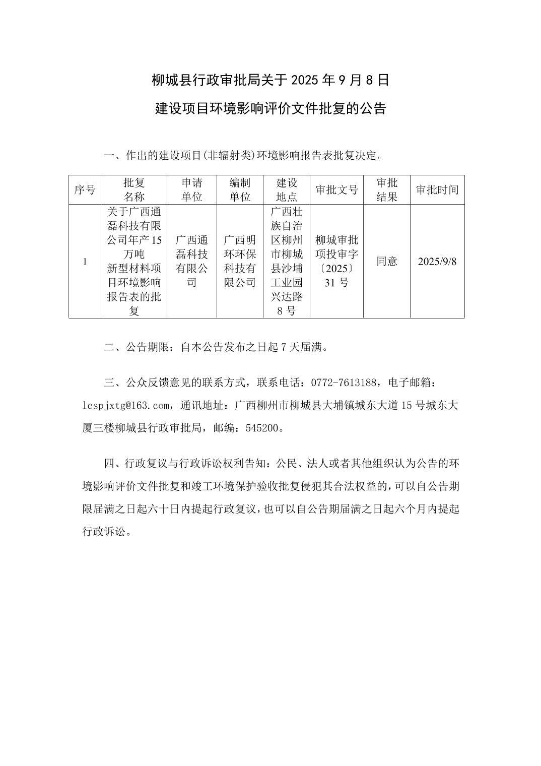 柳城縣行政審批局關于2025年9月8日建設項目環(huán)境影響評價文件批復的公告