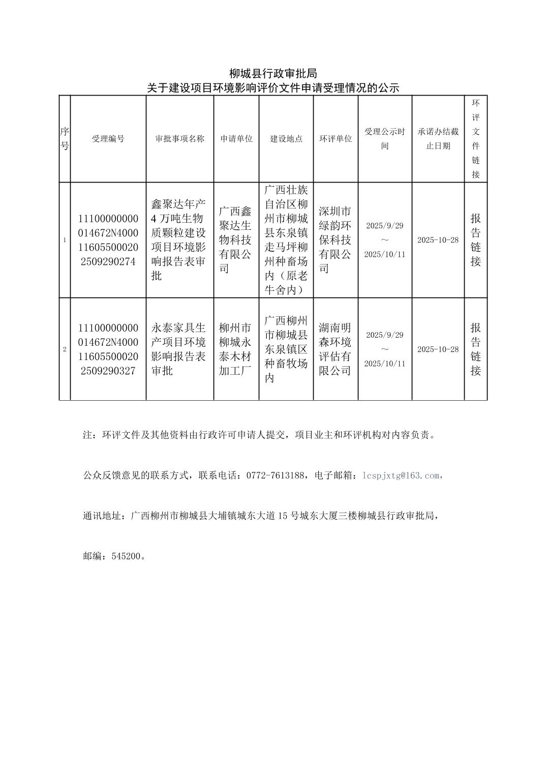 2025年9月29日柳城縣行政審批局關于建設項目環(huán)境影響評價文件申請受理情況的公示