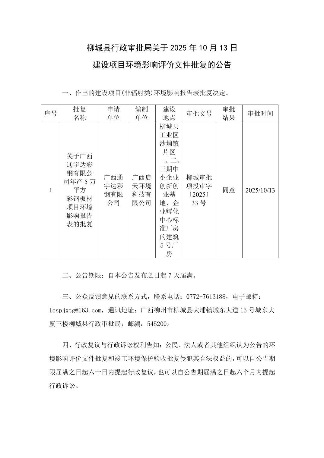 〔2025〕33號(hào)-關(guān)于廣西通宇達(dá)彩鋼有限公司年產(chǎn)5萬(wàn)平方彩鋼板項(xiàng)目的批復(fù).docx