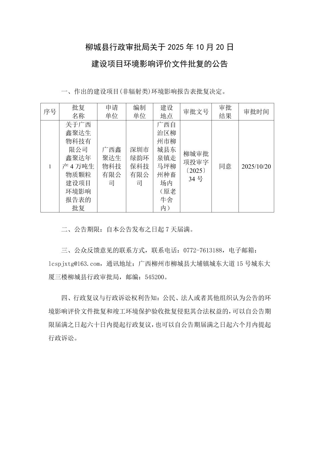 柳城縣行政審批局關(guān)于2025年10月20日建設(shè)項(xiàng)目環(huán)境影響評價(jià)文件批復(fù)的公告