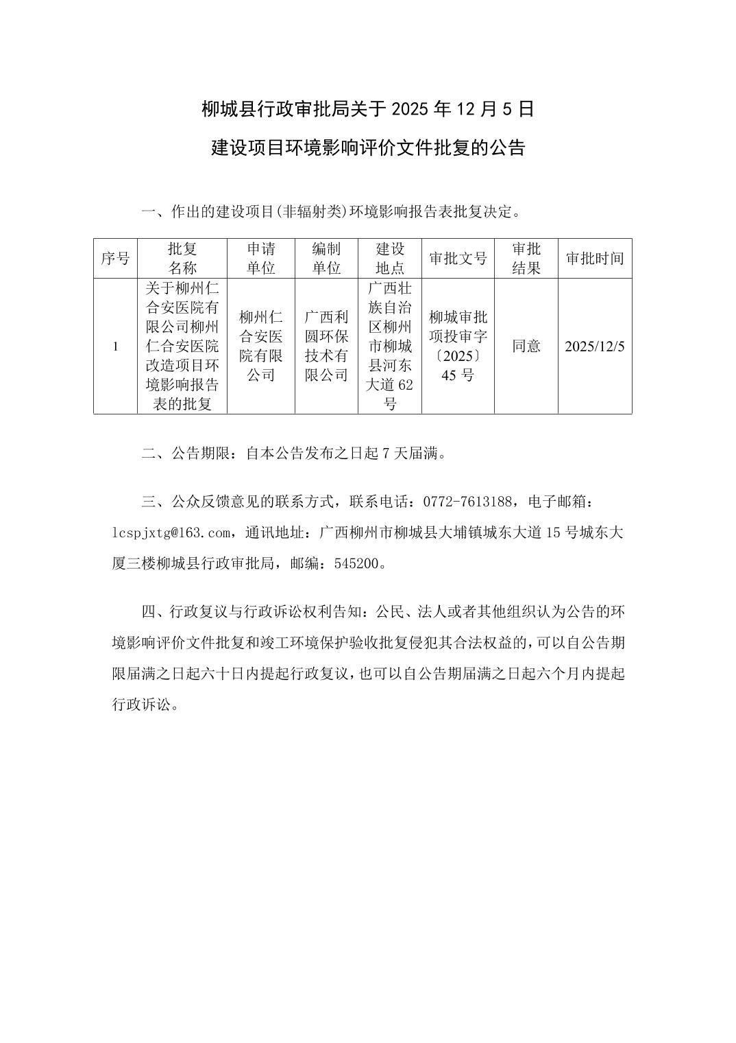 柳城縣行政審批局關于2025年12月5日建設項目環(huán)境影響評價文件批復的公告