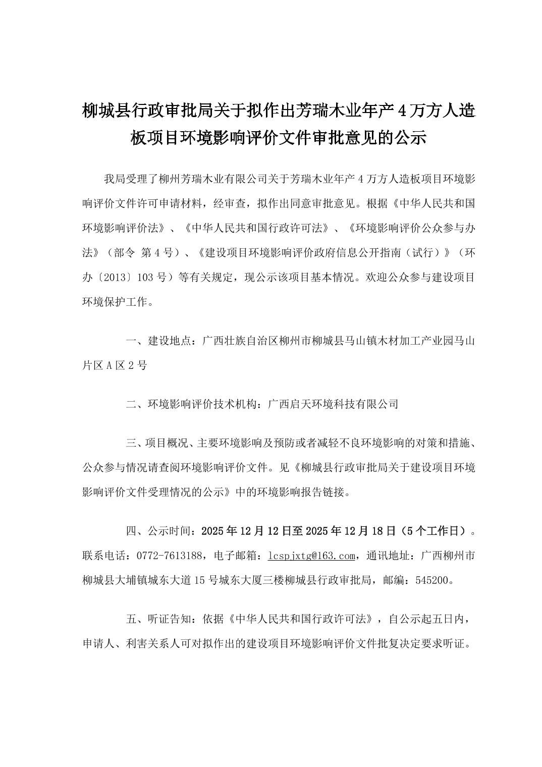 柳城縣行政審批局關于擬作出芳瑞木業(yè)年產(chǎn)4萬方人造板項目環(huán)境影響評價文件審批意見的公示
