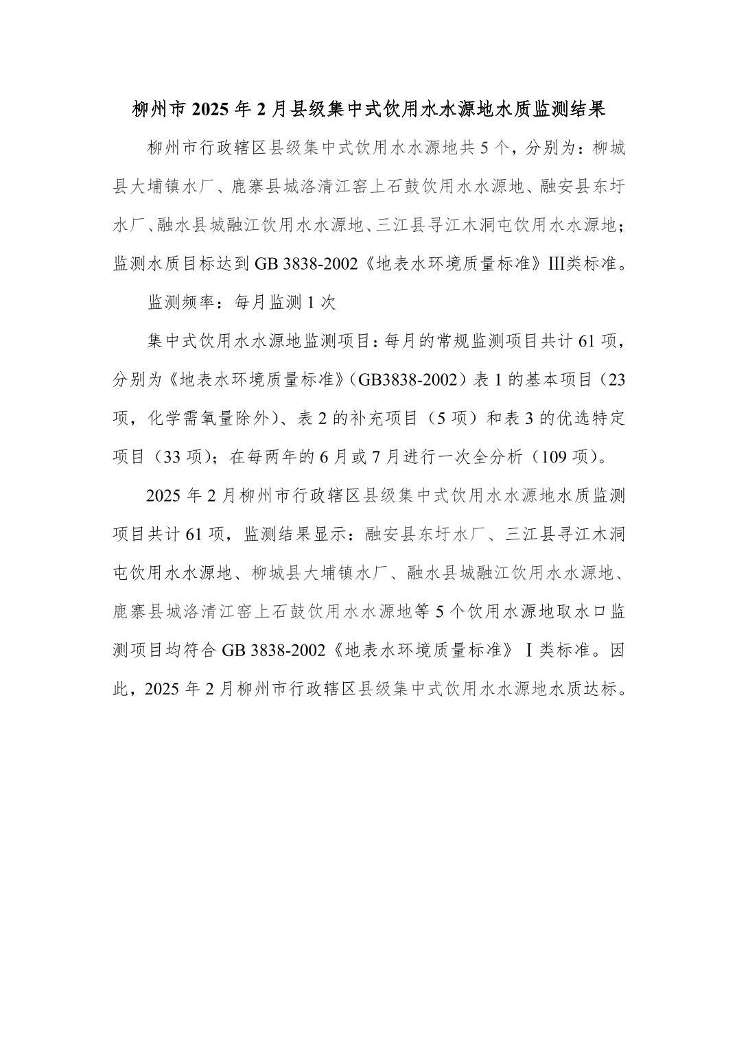 2025年2月份柳州市縣級飲用水質(zhì)量報告