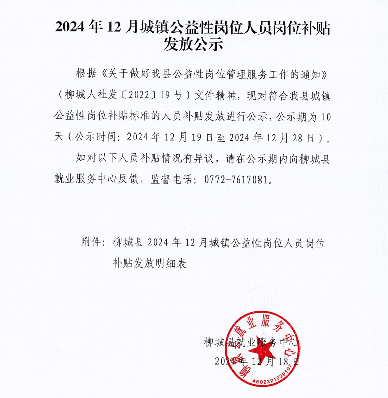 2024年12月城鎮(zhèn)公益性崗位人員崗位補(bǔ)貼發(fā)放公示